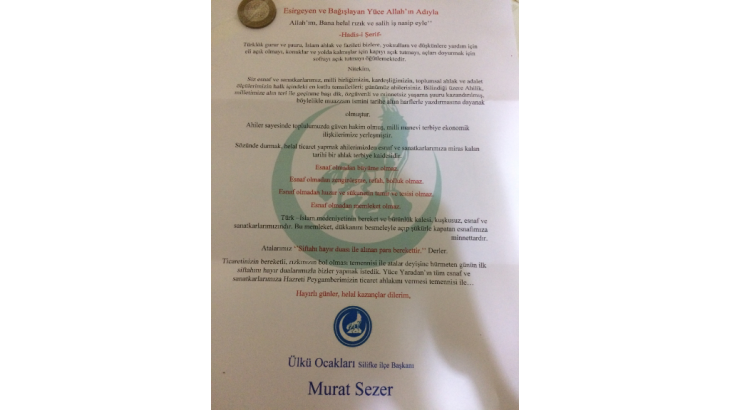 Ülkü Ocakları Silifke ilçe başkanlığı, ahilik şuurunun unutulmaması için başlattığı bir çalışma ile ilçede bulunan esnaflara sabaha karşı zarflar içinde 1 Lira siftah bıraktı.